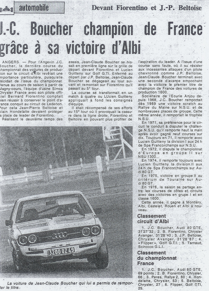 La marque NSU ensuite absorbée par Audi, Jean-Claude changea sa NSU contre une Audi 80 GTE, avec laquelle il remporta le Championnat de France en Circuit des voitures de production en 1977, classe – 0160.